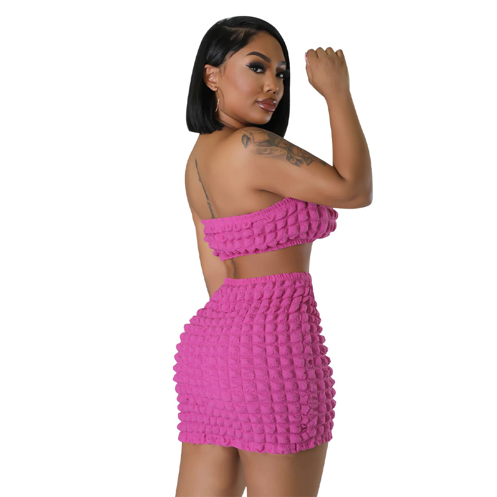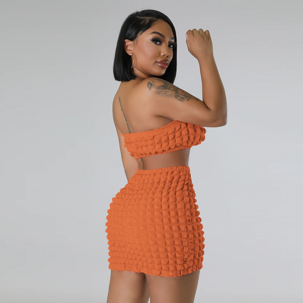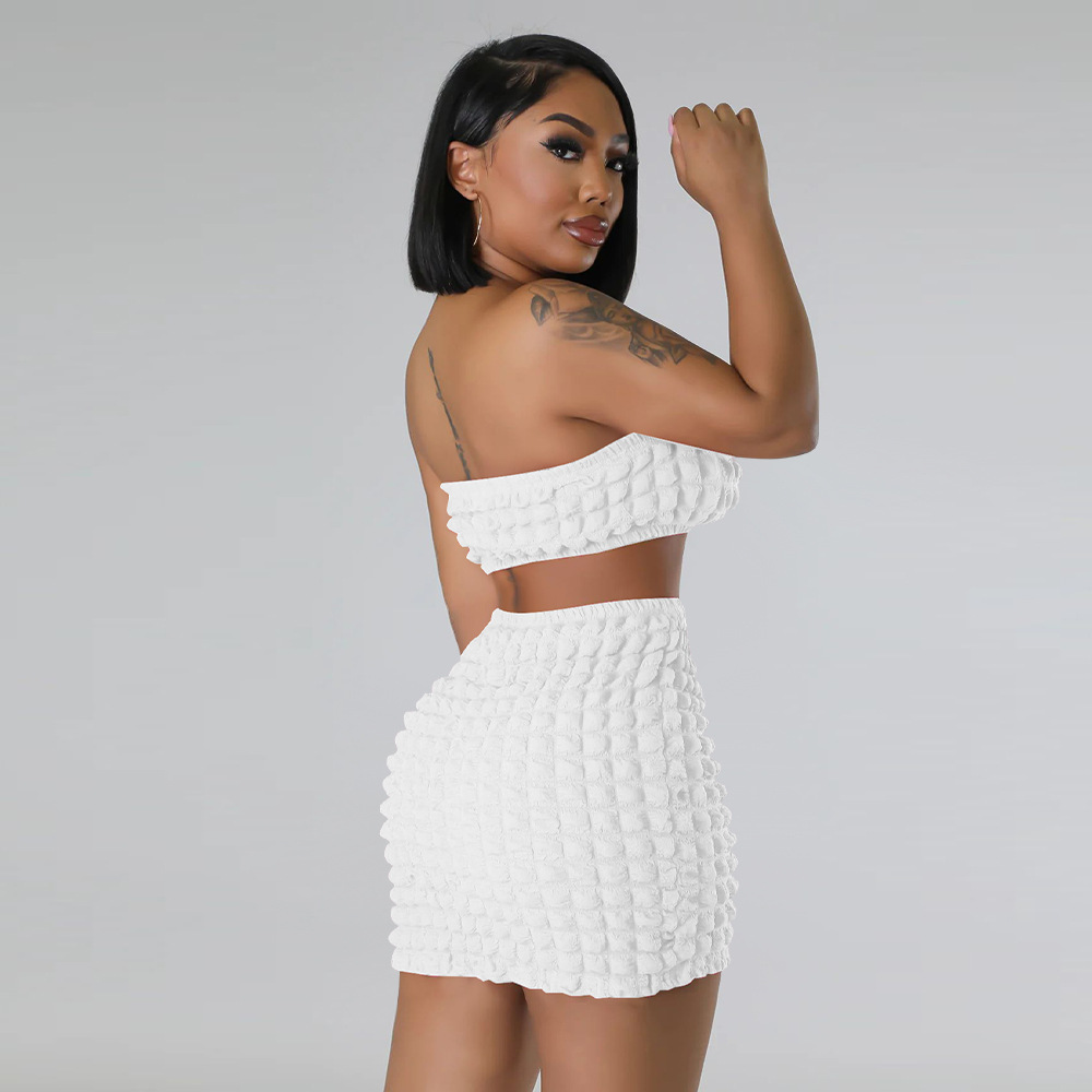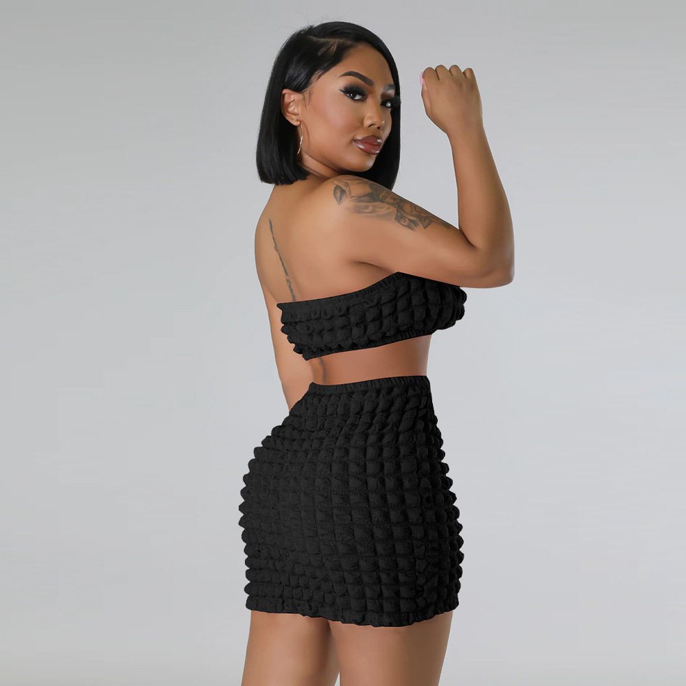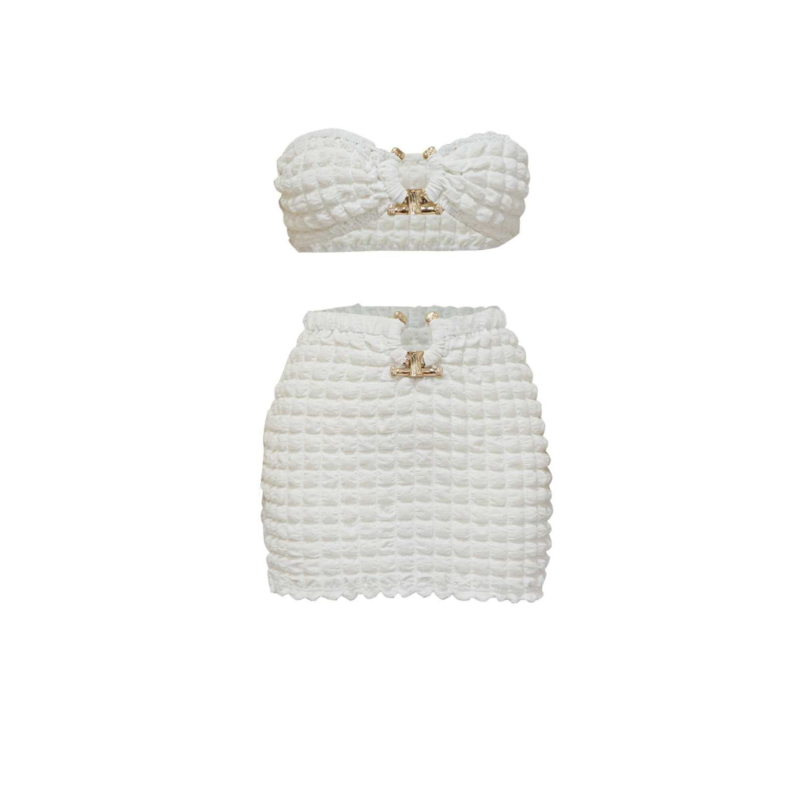 Turn up the heat in this flirty popcorn-textured set. Includes a figure-hugging crop top and short skirt for a bold, confident look you’ll love.
