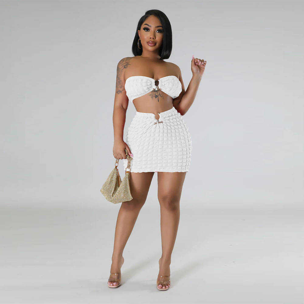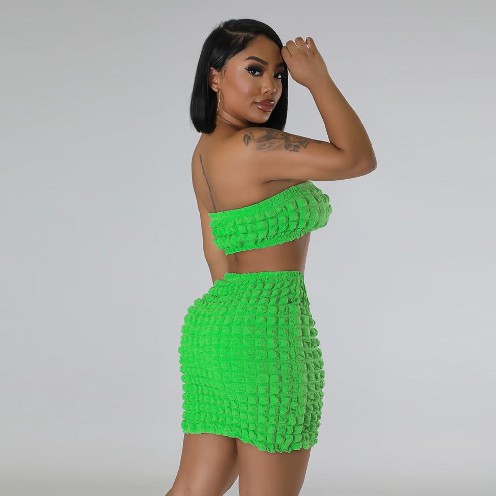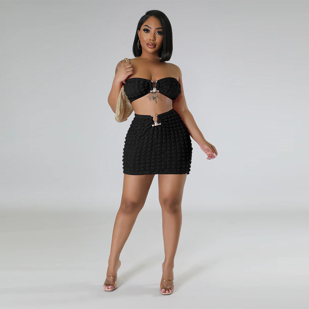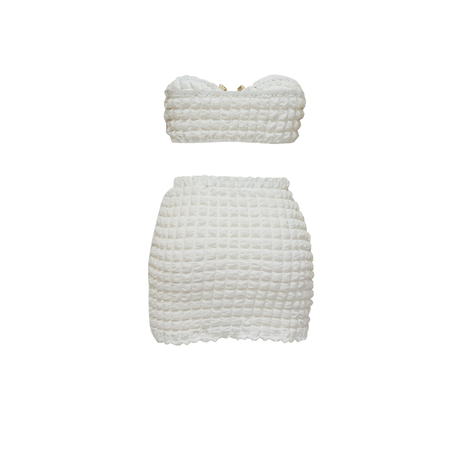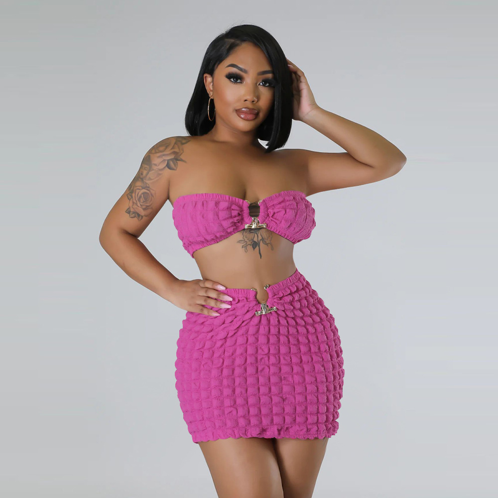Turn up the heat in this flirty popcorn-textured set. Includes a figure-hugging crop top and short skirt for a bold, confident look you’ll love.