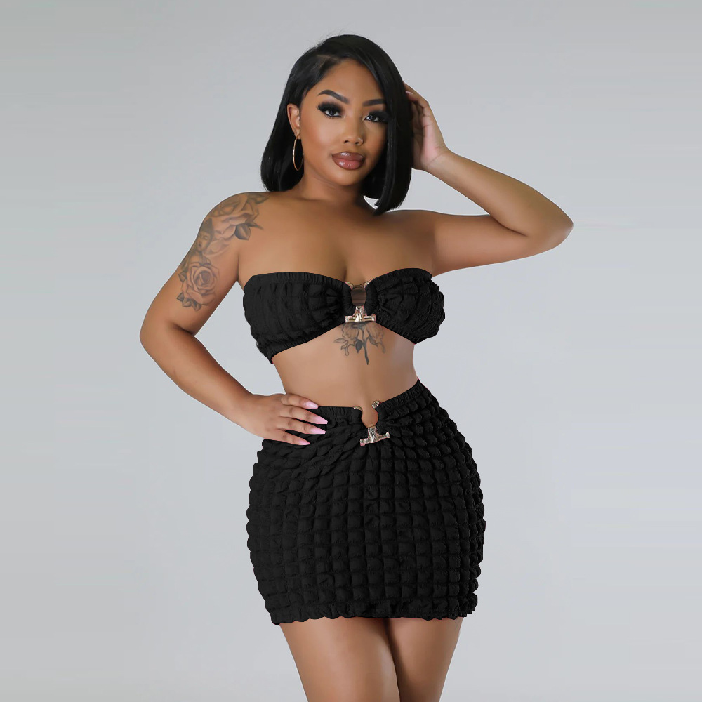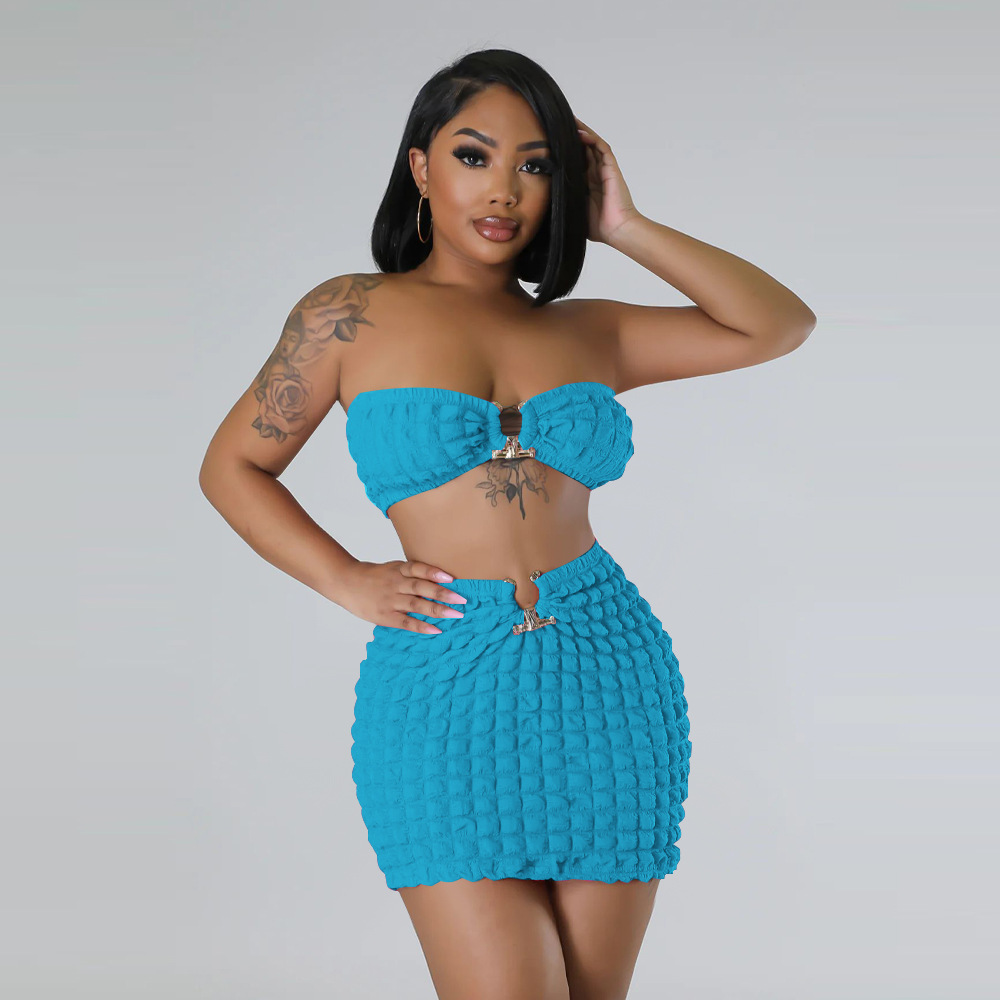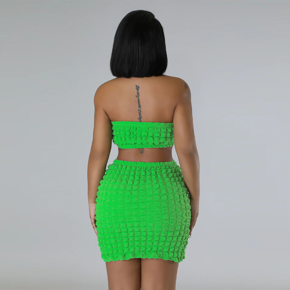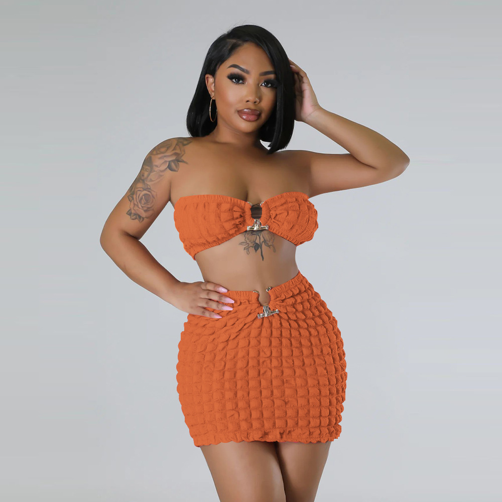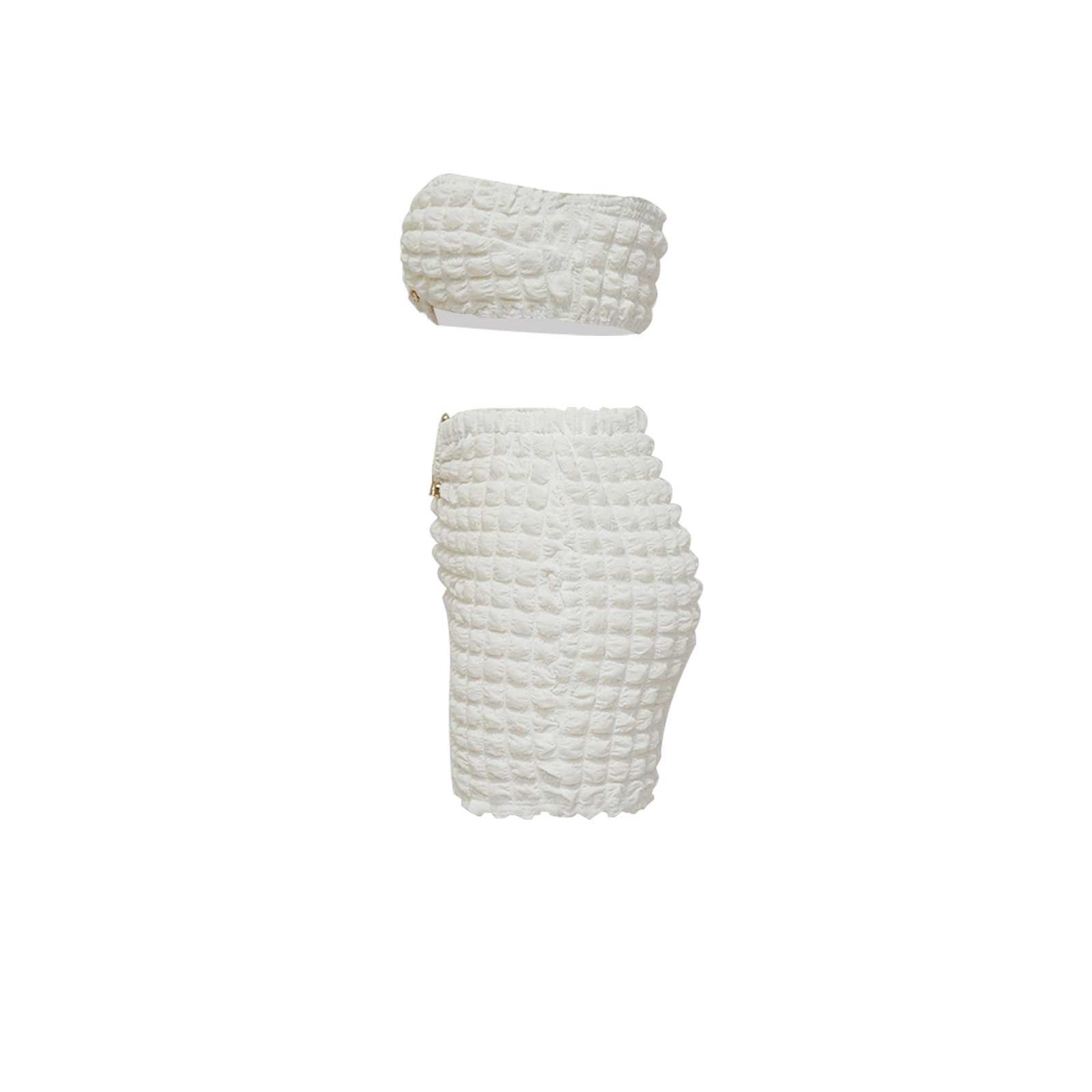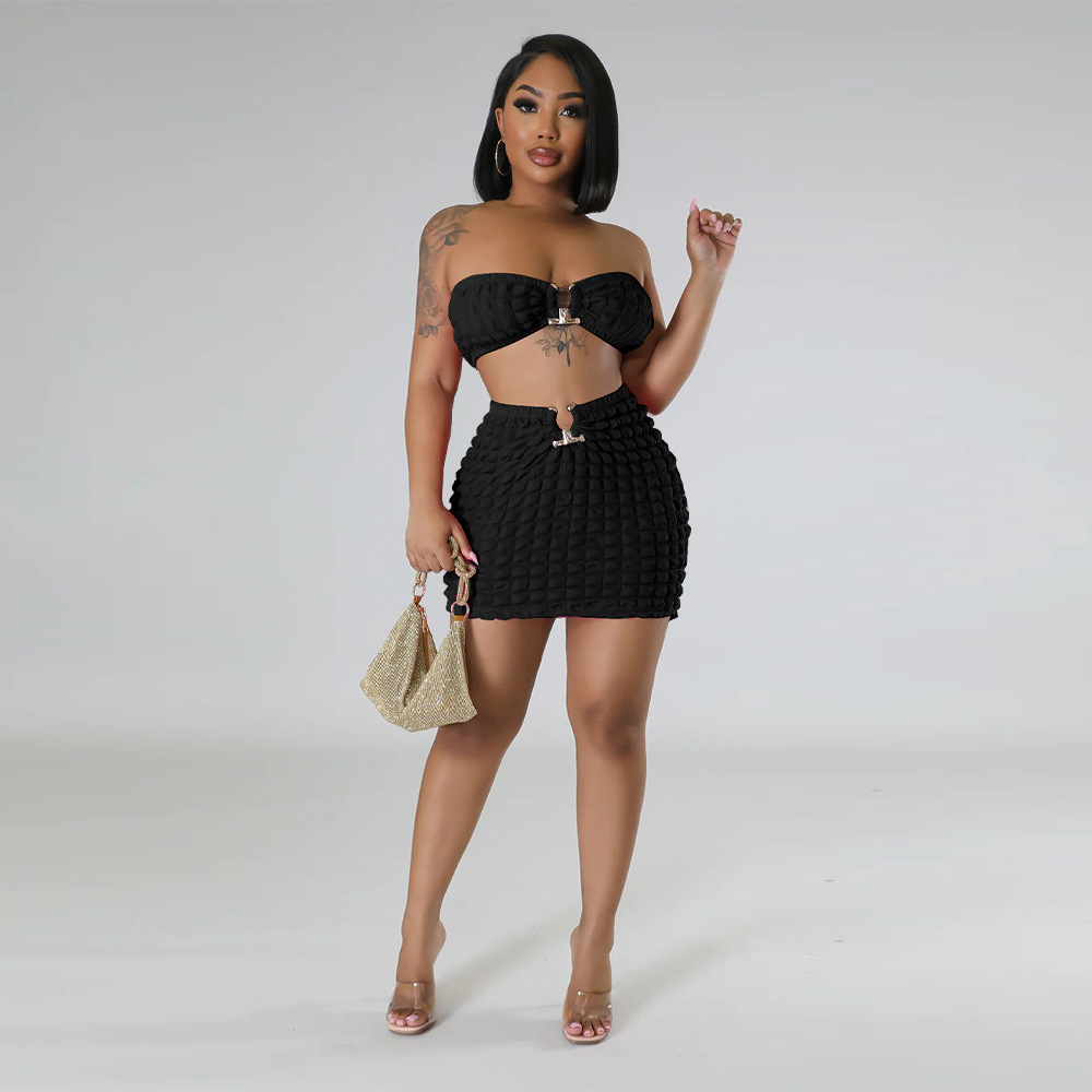 Turn up the heat in this flirty popcorn-textured set. Includes a figure-hugging crop top and short skirt for a bold, confident look you’ll love.