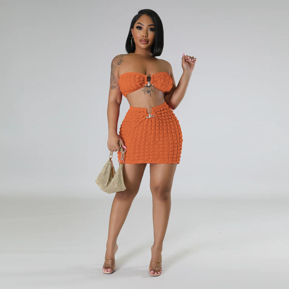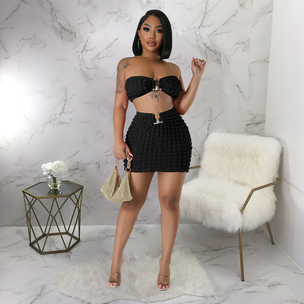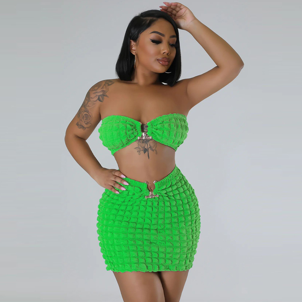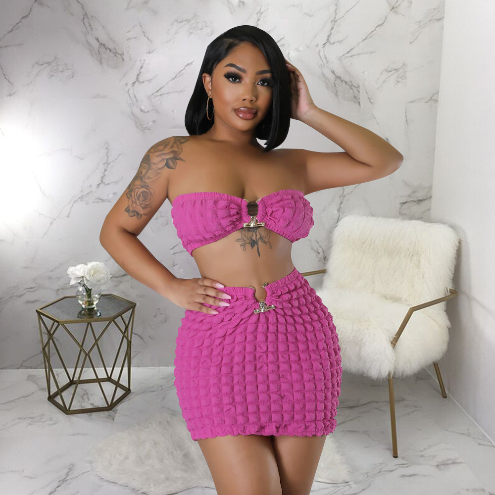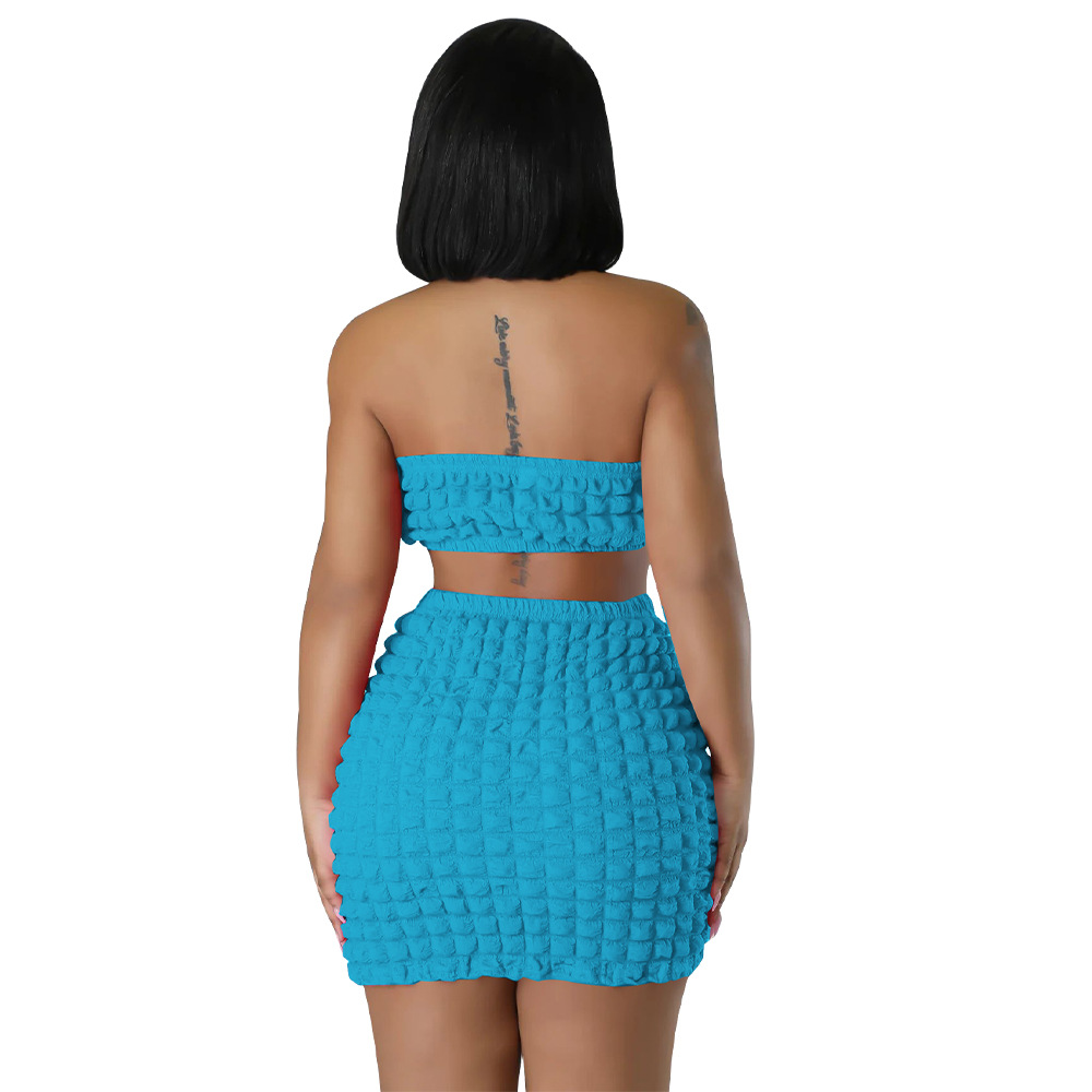 Turn up the heat in this flirty popcorn-textured set. Includes a figure-hugging crop top and short skirt for a bold, confident look you’ll love.